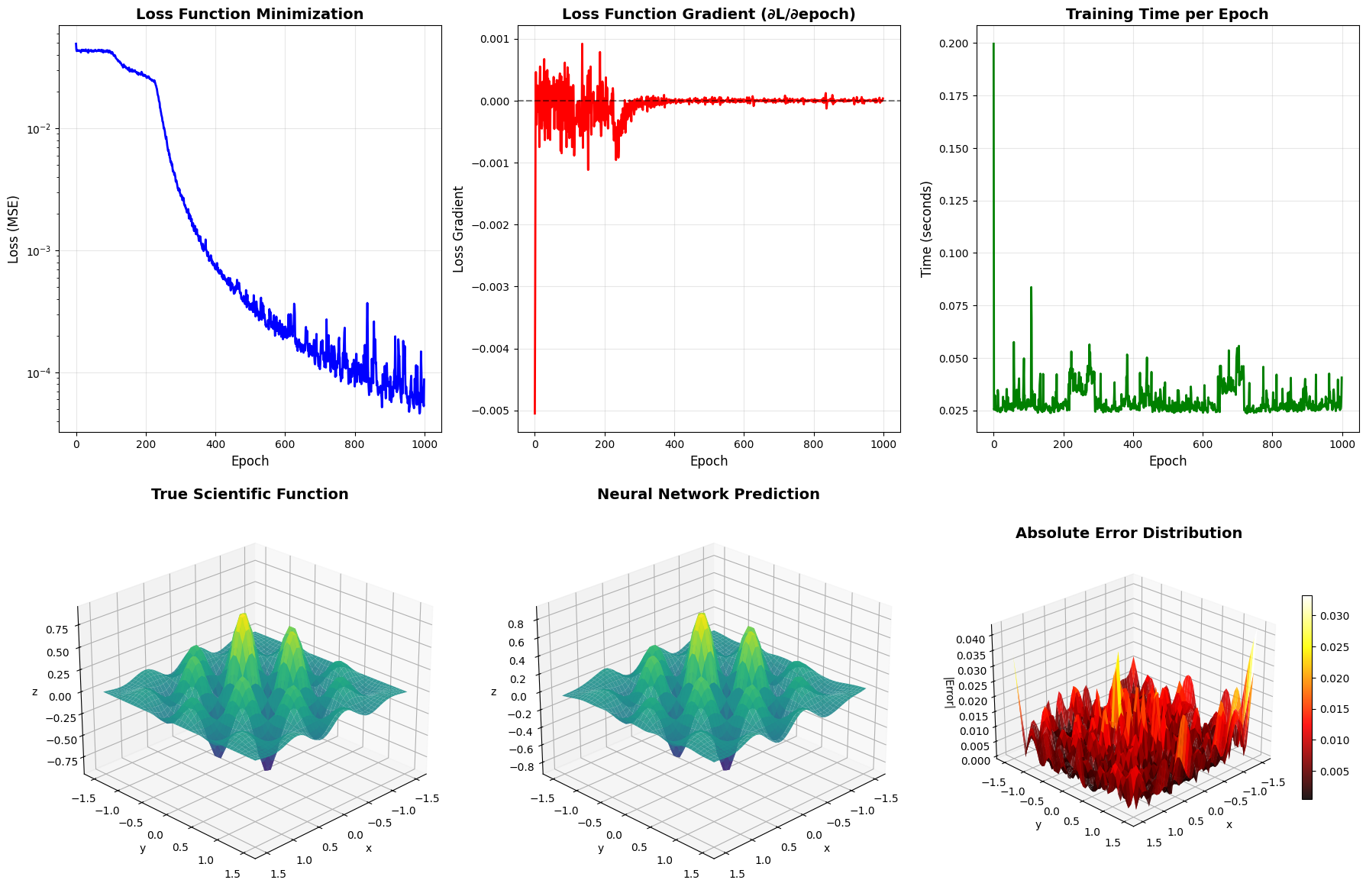 This implementation demonstrates effective loss function minimization for scientific data analysis. The neural network successfully learns the complex nonlinear relationship, achieving high accuracy through systematic gradient-based optimization. The visualizations clearly show the convergence process and the quality of the learned approximation.