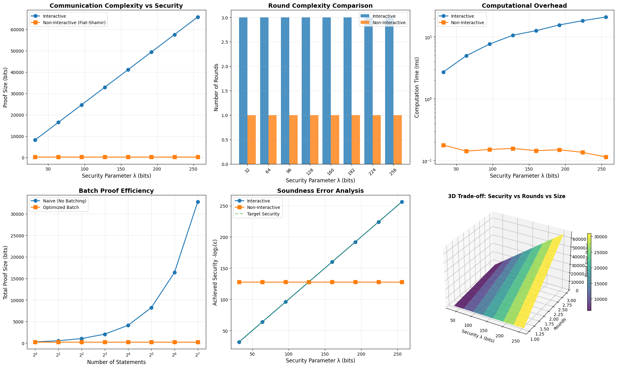 def visualize_results(security_params, interactive_results, non_interactive_results, batch_sizes, batch_results): """Create comprehensive visualizations""" fig = plt.figure(figsize=(20, 12)) ax1 = fig.add_subplot(2, 3, 1) interactive_sizes = [m.proof_size_bits for m in interactive_results] non_interactive_sizes = [m.proof_size_bits for m in non_interactive_results] ax1.plot(security_params, interactive_sizes, 'o-', label='Interactive', linewidth=2, markersize=8) ax1.plot(security_params, non_interactive_sizes, 's-', label='Non-Interactive (Fiat-Shamir)', linewidth=2, markersize=8) ax1.set_xlabel('Security Parameter λ (bits)', fontsize=12) ax1.set_ylabel('Proof Size (bits)', fontsize=12) ax1.set_title('Communication Complexity vs Security', fontsize=14, fontweight='bold') ax1.legend(fontsize=10) ax1.grid(True, alpha=0.3) ax2 = fig.add_subplot(2, 3, 2) interactive_rounds = [m.rounds for m in interactive_results] non_interactive_rounds = [m.rounds for m in non_interactive_results] ax2.bar(np.arange(len(security_params)) - 0.2, interactive_rounds, 0.4, label='Interactive', alpha=0.8) ax2.bar(np.arange(len(security_params)) + 0.2, non_interactive_rounds, 0.4, label='Non-Interactive', alpha=0.8) ax2.set_xlabel('Security Parameter λ (bits)', fontsize=12) ax2.set_ylabel('Number of Rounds', fontsize=12) ax2.set_title('Round Complexity Comparison', fontsize=14, fontweight='bold') ax2.set_xticks(np.arange(len(security_params))) ax2.set_xticklabels(security_params, rotation=45) ax2.legend(fontsize=10) ax2.grid(True, alpha=0.3, axis='y') ax3 = fig.add_subplot(2, 3, 3) interactive_times = [m.computation_time * 1000 for m in interactive_results] non_interactive_times = [m.computation_time * 1000 for m in non_interactive_results] ax3.semilogy(security_params, interactive_times, 'o-', label='Interactive', linewidth=2, markersize=8) ax3.semilogy(security_params, non_interactive_times, 's-', label='Non-Interactive', linewidth=2, markersize=8) ax3.set_xlabel('Security Parameter λ (bits)', fontsize=12) ax3.set_ylabel('Computation Time (ms)', fontsize=12) ax3.set_title('Computational Overhead', fontsize=14, fontweight='bold') ax3.legend(fontsize=10) ax3.grid(True, alpha=0.3) ax4 = fig.add_subplot(2, 3, 4) batch_sizes_list = batch_sizes batch_proof_sizes = [m.proof_size_bits for m in batch_results] naive_sizes = [256 * size for size in batch_sizes_list] ax4.plot(batch_sizes_list, naive_sizes, 'o-', label='Naive (No Batching)', linewidth=2, markersize=8) ax4.plot(batch_sizes_list, batch_proof_sizes, 's-', label='Optimized Batch', linewidth=2, markersize=8) ax4.set_xlabel('Number of Statements', fontsize=12) ax4.set_ylabel('Total Proof Size (bits)', fontsize=12) ax4.set_title('Batch Proof Efficiency', fontsize=14, fontweight='bold') ax4.legend(fontsize=10) ax4.grid(True, alpha=0.3) ax4.set_xscale('log', base=2) ax5 = fig.add_subplot(2, 3, 5) interactive_errors = [-np.log2(m.soundness_error) for m in interactive_results] non_interactive_errors = [-np.log2(m.soundness_error) for m in non_interactive_results] ax5.plot(security_params, interactive_errors, 'o-', label='Interactive', linewidth=2, markersize=8) ax5.plot(security_params, non_interactive_errors, 's-', label='Non-Interactive', linewidth=2, markersize=8) ax5.plot(security_params, security_params, '--', label='Target Security', linewidth=2, alpha=0.5) ax5.set_xlabel('Security Parameter λ (bits)', fontsize=12) ax5.set_ylabel('Achieved Security -log₂(ε)', fontsize=12) ax5.set_title('Soundness Error Analysis', fontsize=14, fontweight='bold') ax5.legend(fontsize=10) ax5.grid(True, alpha=0.3) ax6 = fig.add_subplot(2, 3, 6, projection='3d') X, Y = np.meshgrid(security_params, [1, 3]) Z_size = np.zeros_like(X, dtype=float) for i, sec_param in enumerate(security_params): Z_size[0, i] = non_interactive_results[i].proof_size_bits Z_size[1, i] = interactive_results[i].proof_size_bits surf = ax6.plot_surface(X, Y, Z_size, cmap='viridis', alpha=0.8, edgecolor='none') ax6.set_xlabel('Security λ (bits)', fontsize=10) ax6.set_ylabel('Rounds', fontsize=10) ax6.set_zlabel('Proof Size (bits)', fontsize=10) ax6.set_title('3D Trade-off: Security vs Rounds vs Size', fontsize=12, fontweight='bold') fig.colorbar(surf, ax=ax6, shrink=0.5) plt.tight_layout() plt.savefig('zkp_communication_analysis.png', dpi=300, bbox_inches='tight') plt.show() fig2 = plt.figure(figsize=(14, 6)) ax7 = fig2.add_subplot(1, 2, 1, projection='3d') batch_x = np.array(batch_sizes_list) batch_y = np.array([m.proof_size_bits for m in batch_results]) batch_z = np.array([m.computation_time * 1000 for m in batch_results]) ax7.scatter(batch_x, batch_y, batch_z, c=batch_z, cmap='plasma', s=100, alpha=0.8) ax7.plot(batch_x, batch_y, batch_z, 'b-', alpha=0.5, linewidth=2) ax7.set_xlabel('Batch Size', fontsize=11) ax7.set_ylabel('Proof Size (bits)', fontsize=11) ax7.set_zlabel('Time (ms)', fontsize=11) ax7.set_title('Batch Protocol: Size-Time Trade-off', fontsize=13, fontweight='bold') ax8 = fig2.add_subplot(1, 2, 2, projection='3d') batch_array = np.array(batch_sizes_list) efficiency_naive = batch_array * 256 efficiency_batch = np.array([m.proof_size_bits for m in batch_results]) compression_ratio = efficiency_naive / efficiency_batch X_batch = np.tile(batch_array.reshape(-1, 1), (1, 2)) Y_methods = np.tile(np.array([0, 1]).reshape(1, -1), (len(batch_array), 1)) Z_efficiency = np.column_stack([efficiency_batch, efficiency_naive]) for i in range(len(batch_array)): ax8.plot([batch_array[i], batch_array[i]], [0, 1], [efficiency_batch[i], efficiency_naive[i]], 'gray', alpha=0.3) ax8.scatter(X_batch[:, 0], Y_methods[:, 0], Z_efficiency[:, 0], c='green', s=100, label='Batch', alpha=0.8) ax8.scatter(X_batch[:, 1], Y_methods[:, 1], Z_efficiency[:, 1], c='red', s=100, label='Naive', alpha=0.8) ax8.set_xlabel('Number of Statements', fontsize=11) ax8.set_ylabel('Method', fontsize=11) ax8.set_zlabel('Total Proof Size (bits)', fontsize=11) ax8.set_yticks([0, 1]) ax8.set_yticklabels(['Batch', 'Naive']) ax8.set_title('Bat