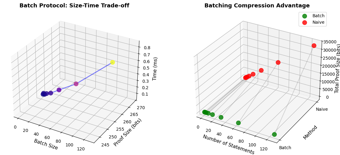 for i, batch_size in enumerate(batch_sizes): naive_size = batch_size * 256 actual_size = batch_results[i].proof_size_bits ratio = naive_size / actual_size time_ms = batch_results[i].computation_time * 1000 print(f"{batch_size:<12} {actual_size:<20} {naive_size:<20} {ratio:<20.2f}x {time_ms:<12.4f}")