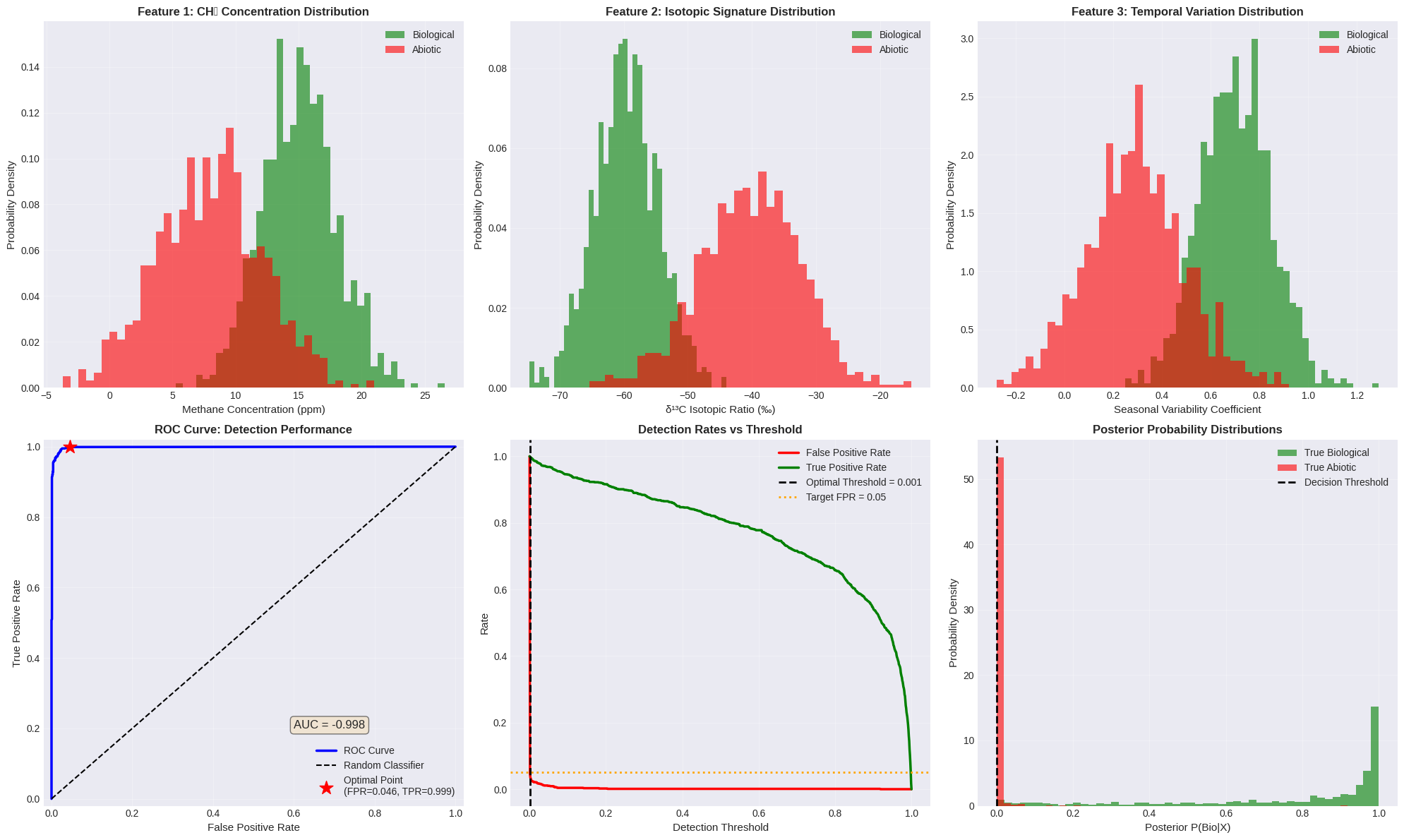 ax6.hist(bio_posteriors, bins=50, alpha=0.6, label='True Biological', color='green', density=True) ax6.hist(abiotic_posteriors, bins=50, alpha=0.6, label='True Abiotic', color='red', density=True) ax6.axvline(optimal_threshold, color='black', linestyle='--', linewidth=2, label=f'Decision Threshold') ax6.set_xlabel('Posterior P(Bio|X)', fontsize=11) ax6.set_ylabel('Probability Density', fontsize=11) ax6.set_title('Posterior Probability Distributions', fontsize=12, fontweight='bold') ax6.legend() ax6.grid(True, alpha=0.3)
