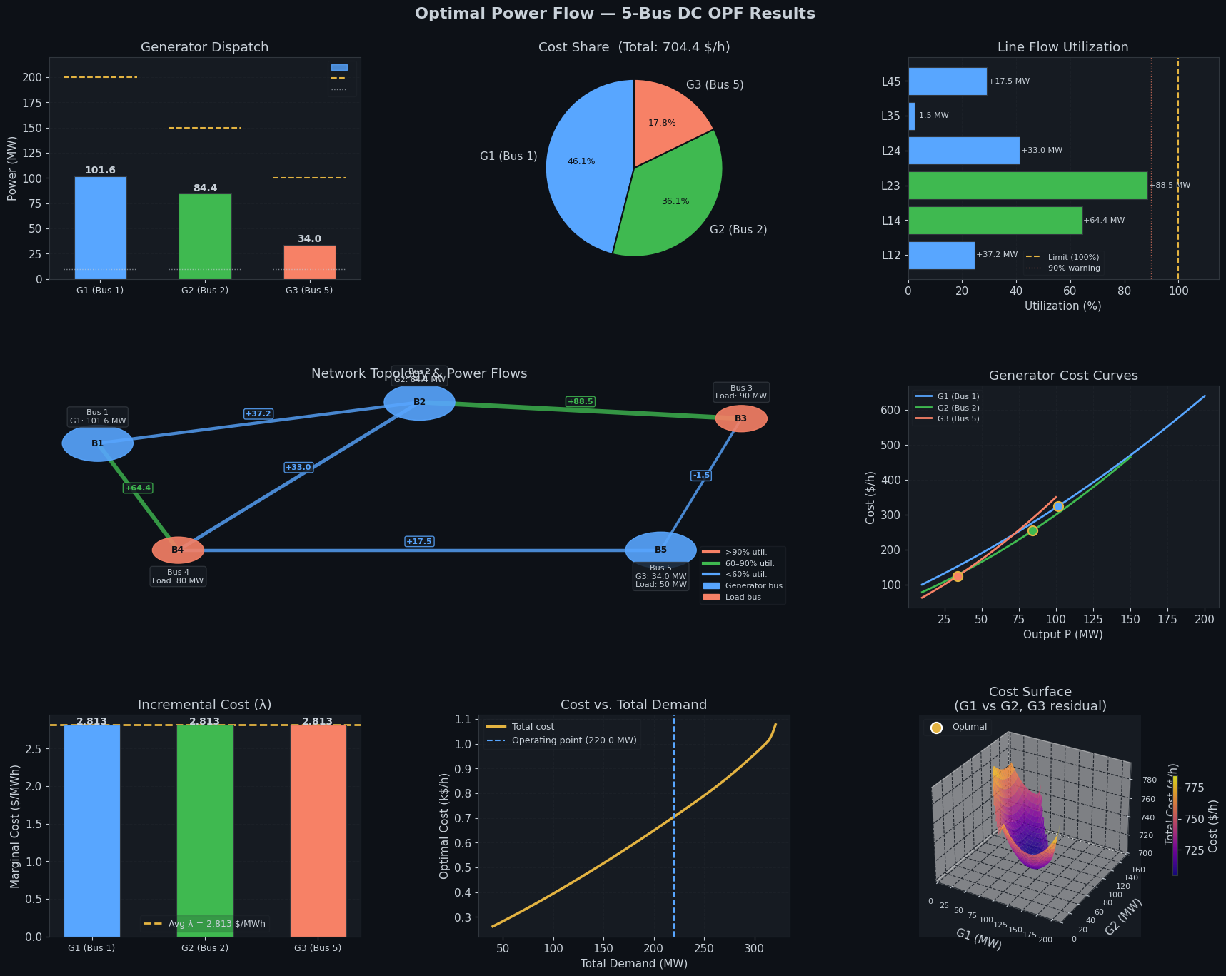 lines_ann = [f"Bus {bus_idx+1}"] gen_idx = np.where(gen_bus == bus_idx)[0] if len(gen_idx) > 0: gi = gen_idx[0] lines_ann.append(f"G{gi+1}: {P_opt[gi]:.1f} MW") if load_bus[bus_idx] > 0: lines_ann.append(f"Load: {load_bus[bus_idx]:.0f} MW") offset = (0.0, 0.32) if by > 1.0 else (0.0, -0.32) ax4.text(bx + offset[0], by + offset[1], "\n".join(lines_ann), ha="center", va="center", fontsize=8, color=TEXT_CLR, bbox={"boxstyle": "round,pad=0.3", "facecolor": PANEL_BG, "edgecolor": "#30363d", "alpha": 0.85})