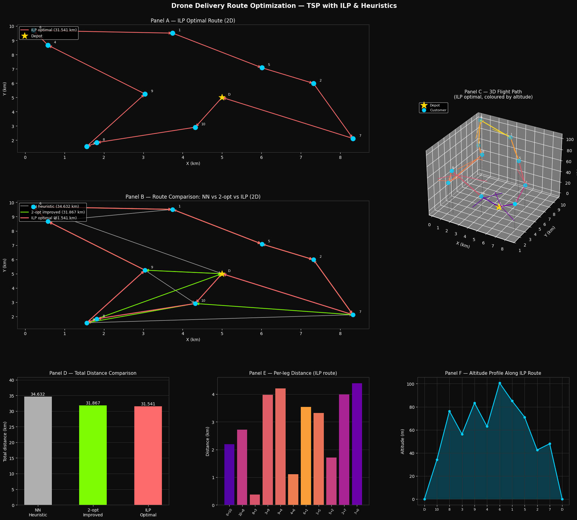 Panel C — 3D Flight Path. The ILP route is lifted into 3D using the per-node altitude assignments. Each flight leg is coloured by average altitude using the plasma colormap — warmer colours indicate higher segments. Vertical dashed poles connect each delivery point to ground level. Quiver arrows show flight direction. This panel captures the true nature of drone operations, where altitude is a continuous variable.