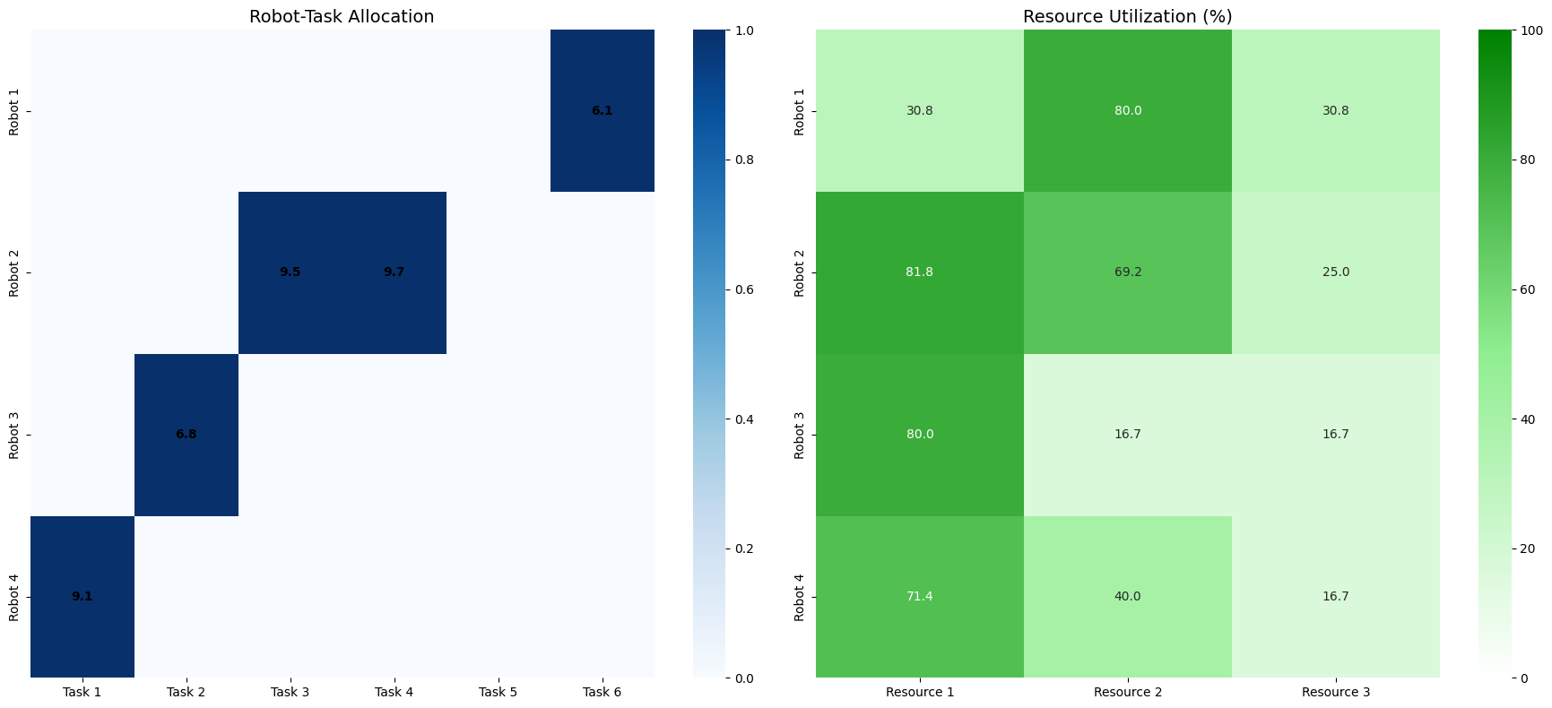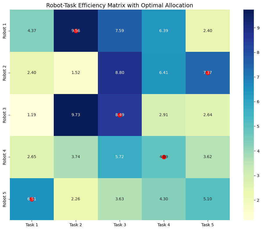 - Allocation Matrix: Shows which robot is assigned to which task along with the efficiency values.