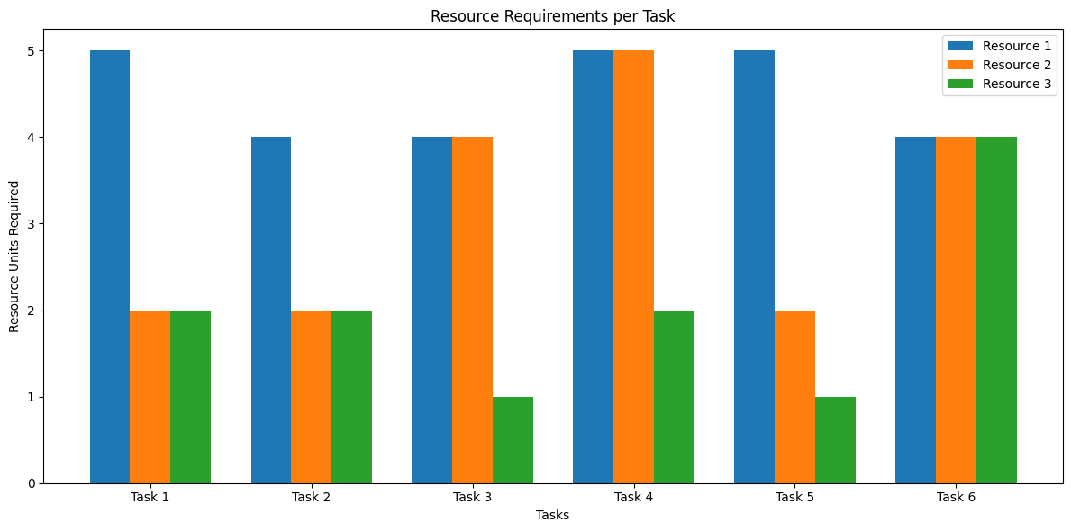 - Task Resource Requirements: A bar chart showing how much of each resource is required by each task.