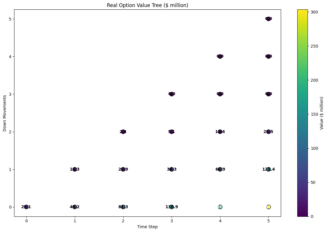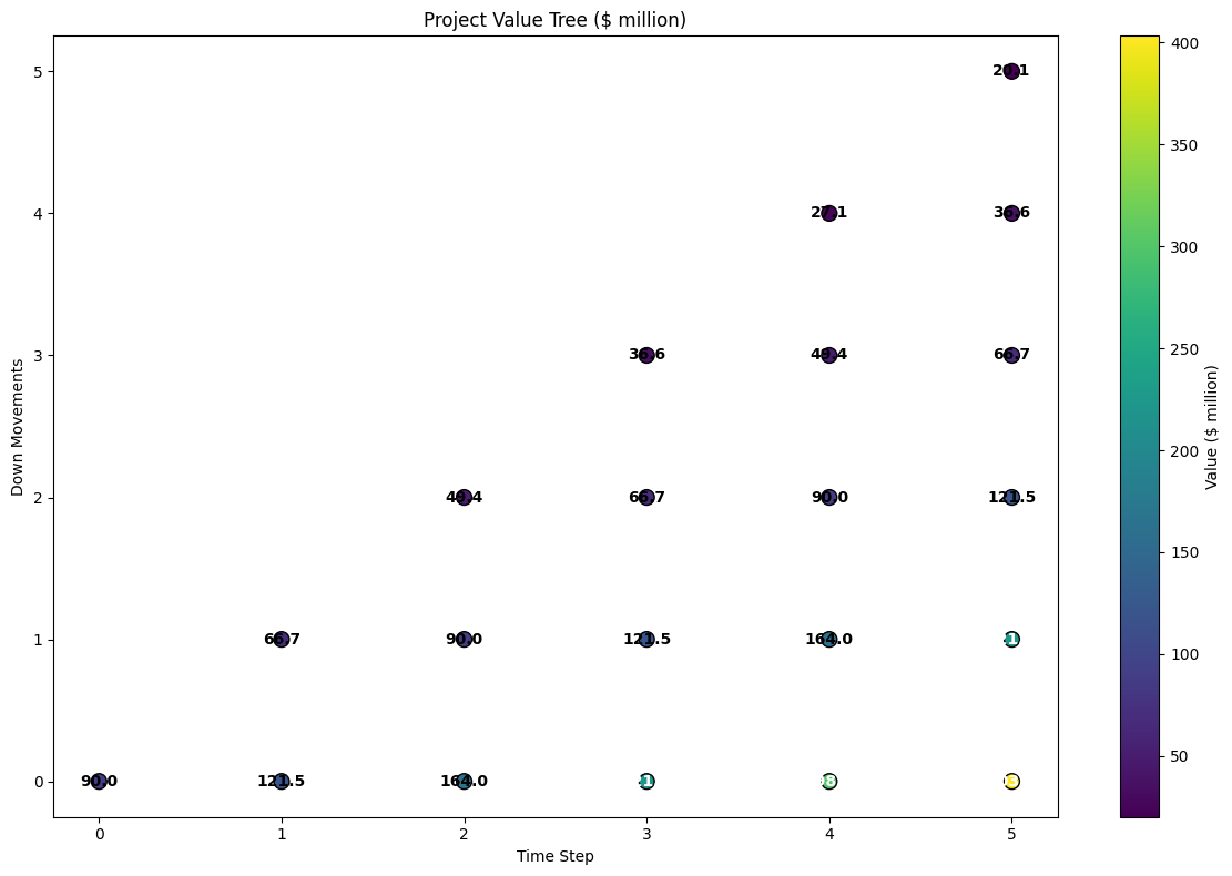 create_asset_tree(): Builds a tree of possible future project valuescalculate_option_tree(): Works backward through the tree to calculate option values at each node
