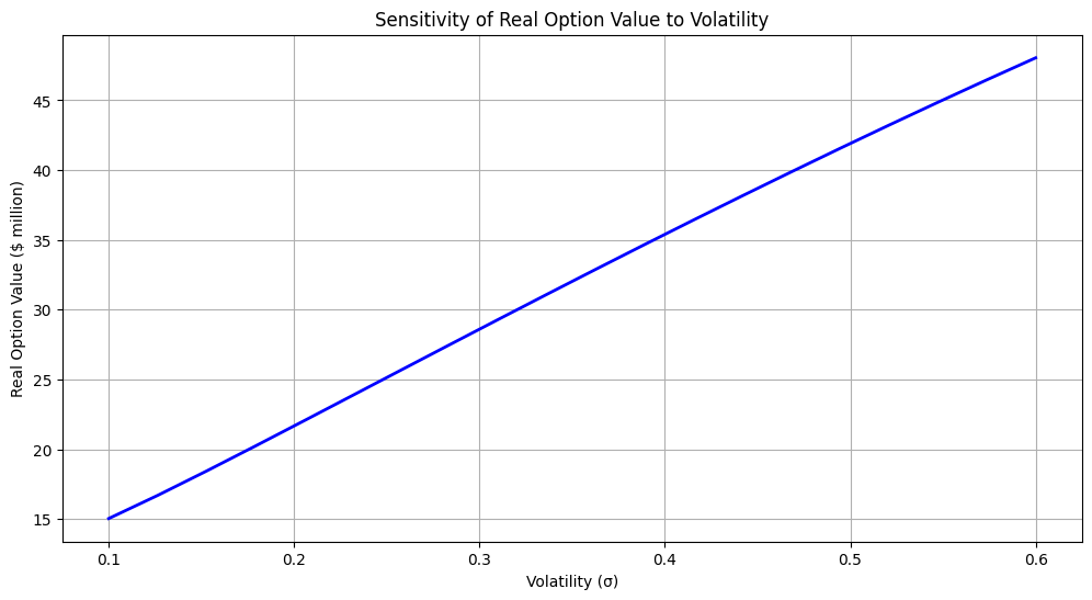 The sensitivity analysis shows that higher volatility increases option value - counterintuitively, more uncertainty can be valuable when you have flexibility.