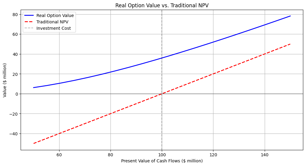 The comparison chart shows that the real option value is always greater than or equal to the traditional NPV.