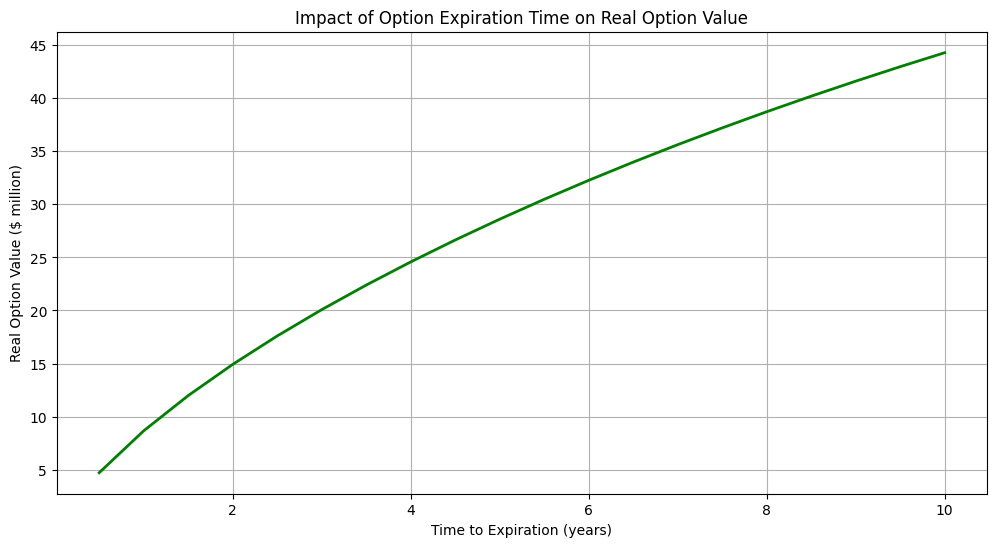S0 = 90: Current present value of expected cash flows ($90 million)K = 100: Investment cost ($100 million)T = 5: Option expiration time (5 years)r = 0.05: Risk-free rate (5%)sigma = 0.3: Volatility of the underlying asset (30%)