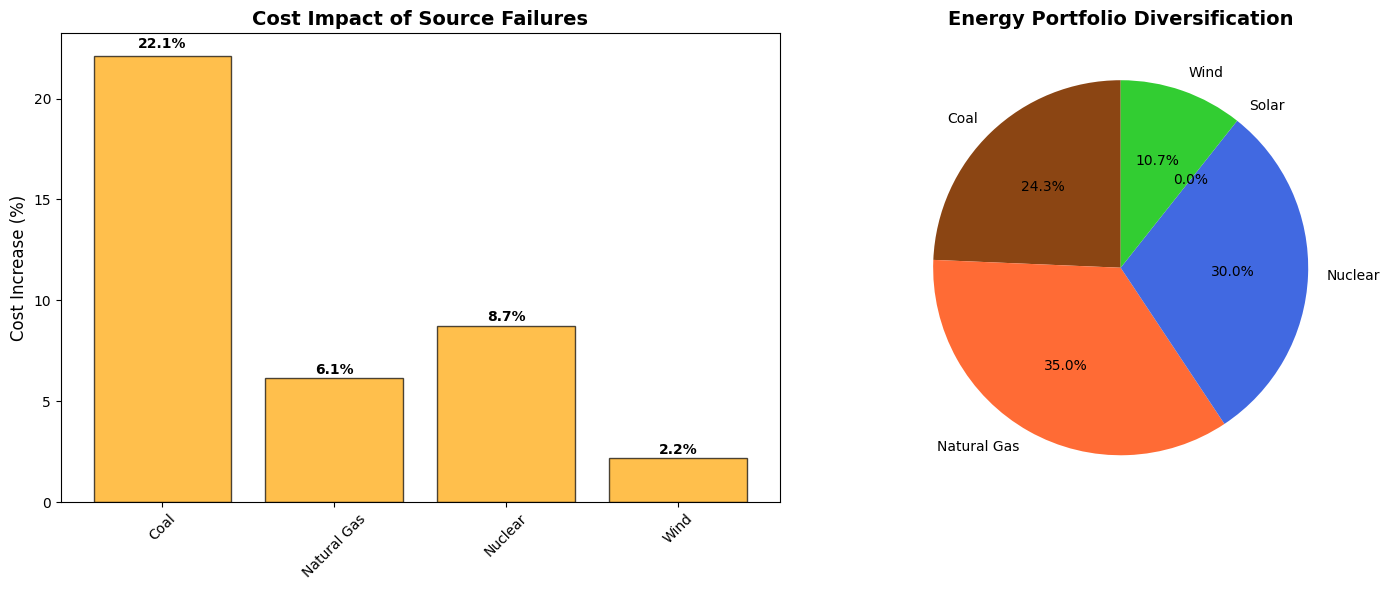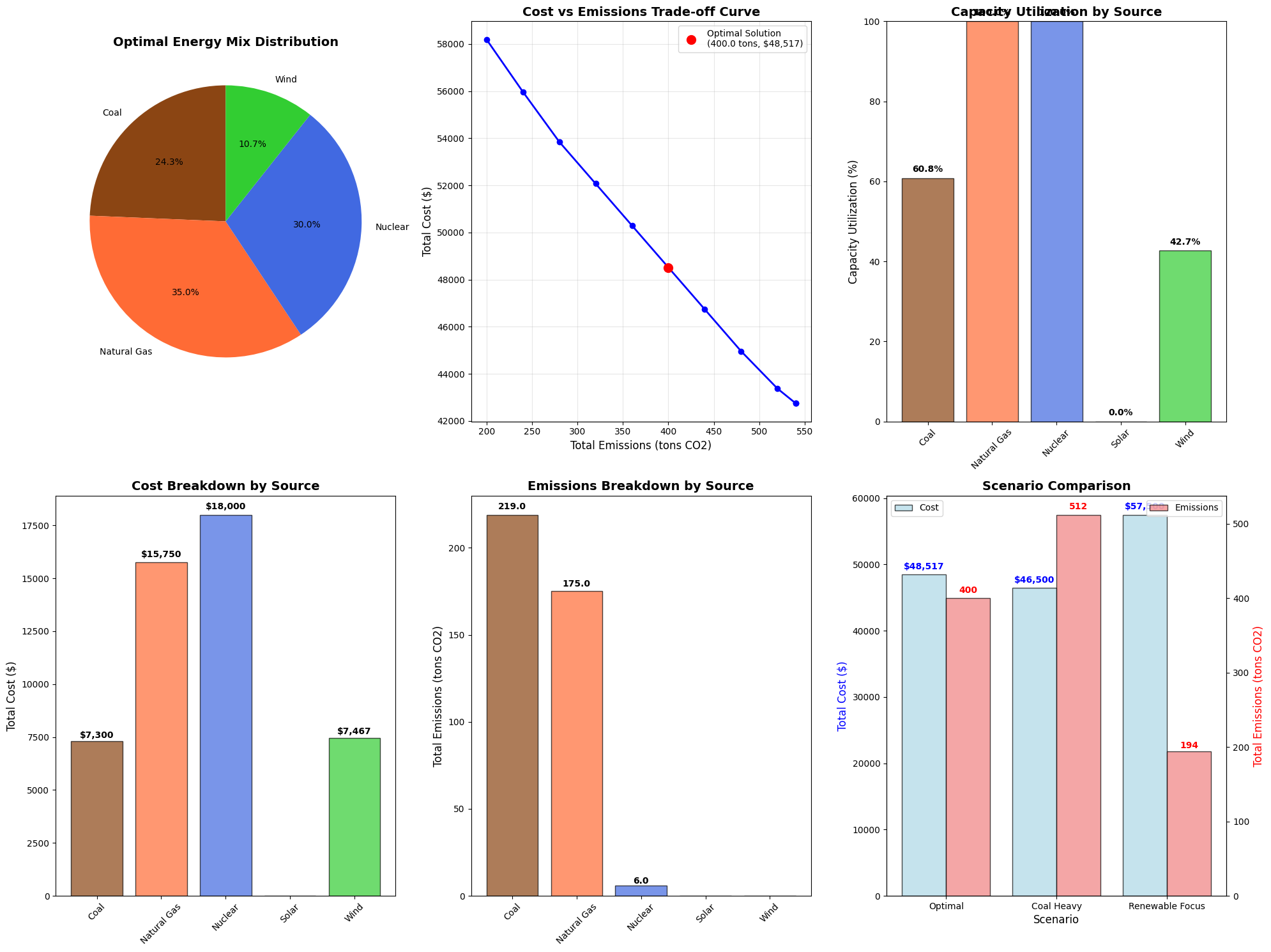 ============================================================ SUMMARY AND RECOMMENDATIONS ============================================================ Key Findings: 1. Optimal mix achieves $48,517 total cost 2. 40.7% of energy comes from clean sources 3. Emission constraint is 100.0% utilized 4. Most vulnerable to Coal failure Strategic Recommendations: • Diversification reduces risk - no single source dominates • Emission constraints drive toward cleaner sources • Consider backup capacity for critical sources • Monitor fuel price volatility for cost-sensitive sources