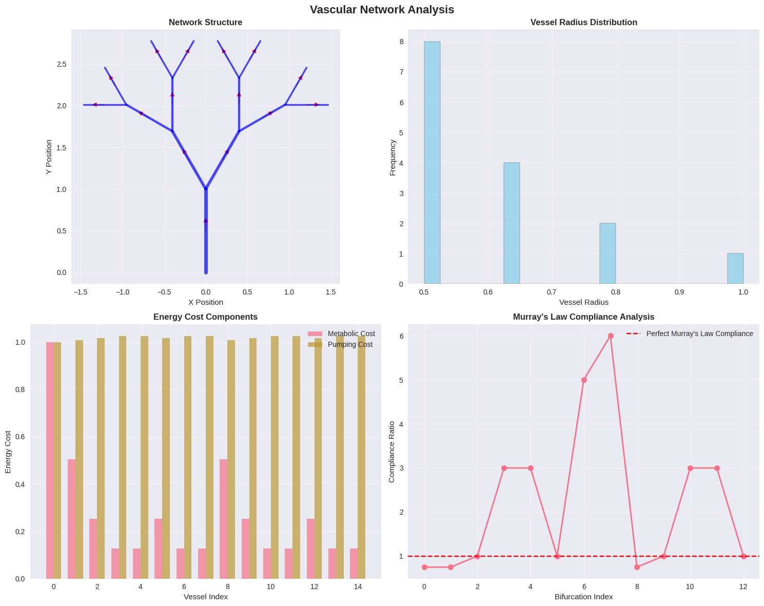 def plot_network_visualization(network): """Create a comprehensive visualization of the vascular network.""" fig, ((ax1, ax2), (ax3, ax4)) = plt.subplots(2, 2, figsize=(15, 12)) fig.suptitle('Vascular Network Analysis', fontsize=16, fontweight='bold') ax1.set_title('Network Structure', fontweight='bold') for vessel in network.vessels: x_coords = [vessel['start'][0], vessel['end'][0]] y_coords = [vessel['start'][1], vessel['end'][1]] linewidth = vessel['radius'] * 5 ax1.plot(x_coords, y_coords, 'b-', linewidth=linewidth, alpha=0.7) mid_x = (vessel['start'][0] + vessel['end'][0]) / 2 mid_y = (vessel['start'][1] + vessel['end'][1]) / 2 dx = vessel['end'][0] - vessel['start'][0] dy = vessel['end'][1] - vessel['start'][1] length = np.sqrt(dx**2 + dy**2) ax1.arrow(mid_x, mid_y, dx/length*0.1, dy/length*0.1, head_width=0.05, head_length=0.05, fc='red', ec='red') ax1.set_xlabel('X Position') ax1.set_ylabel('Y Position') ax1.grid(True, alpha=0.3) ax1.set_aspect('equal') ax2.set_title('Vessel Radius Distribution', fontweight='bold') radii = [vessel['radius'] for vessel in network.vessels] ax2.hist(radii, bins=20, alpha=0.7, color='skyblue', edgecolor='black') ax2.set_xlabel('Vessel Radius') ax2.set_ylabel('Frequency') ax2.grid(True, alpha=0.3) ax3.set_title('Energy Cost Components', fontweight='bold') metabolic_costs = [network.metabolic_cost(vessel) for vessel in network.vessels] pumping_costs = [network.pumping_cost(vessel) for vessel in network.vessels] vessel_indices = range(len(network.vessels)) width = 0.35 ax3.bar([i - width/2 for i in vessel_indices], metabolic_costs, width, label='Metabolic Cost', alpha=0.7) ax3.bar([i + width/2 for i in vessel_indices], pumping_costs, width, label='Pumping Cost', alpha=0.7) ax3.set_xlabel('Vessel Index') ax3.set_ylabel('Energy Cost') ax3.legend() ax3.grid(True, alpha=0.3) ax4.set_title("Murray's Law Compliance Analysis", fontweight='bold') compliance_data = [] for i, vessel in enumerate(network.vessels[:-2]): parent_r = vessel['radius'] if i + 2 < len(network.vessels): r1 = network.vessels[i+1]['radius'] r2 = network.vessels[i+2]['radius'] murray_expected = parent_r**3 murray_actual = r1**3 + r2**3 compliance = murray_actual / murray_expected if murray_expected > 0 else 0 compliance_data.append(compliance) if compliance_data: ax4.plot(compliance_data, 'o-', linewidth=2, markersize=8) ax4.axhline(y=1.0, color='red', linestyle='--', label="Perfect Murray's Law Compliance") ax4.set_xlabel('Bifurcation Index') ax4.set_ylabel('Compliance Ratio') ax4.legend() ax4.grid(True, alpha=0.3) plt.tight_layout() plt.show()