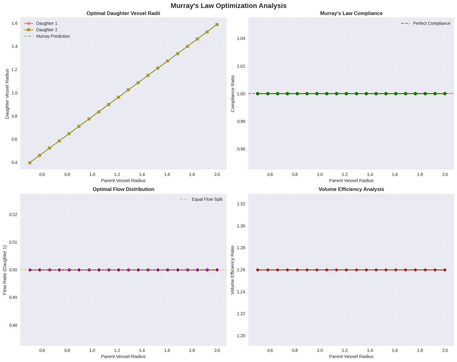 def plot_murray_law_analysis(): """Plot comprehensive Murray's law analysis.""" results = analyze_murray_law() fig, ((ax1, ax2), (ax3, ax4)) = plt.subplots(2, 2, figsize=(15, 12)) fig.suptitle("Murray's Law Optimization Analysis", fontsize=16, fontweight='bold') parent_radii = [r['parent_radius'] for r in results] ax1.set_title('Optimal Daughter Vessel Radii', fontweight='bold') daughter1_radii = [r['daughter1_radius'] for r in results] daughter2_radii = [r['daughter2_radius'] for r in results] ax1.plot(parent_radii, daughter1_radii, 'o-', label='Daughter 1', linewidth=2) ax1.plot(parent_radii, daughter2_radii, 's-', label='Daughter 2', linewidth=2) ax1.plot(parent_radii, [p/2**(1/3) for p in parent_radii], '--', label='Murray Prediction', alpha=0.7) ax1.set_xlabel('Parent Vessel Radius') ax1.set_ylabel('Daughter Vessel Radius') ax1.legend() ax1.grid(True, alpha=0.3) ax2.set_title("Murray's Law Compliance", fontweight='bold') compliance = [r['murray_compliance'] for r in results] ax2.plot(parent_radii, compliance, 'o-', color='green', linewidth=2, markersize=8) ax2.axhline(y=1.0, color='red', linestyle='--', label='Perfect Compliance', alpha=0.7) ax2.set_xlabel('Parent Vessel Radius') ax2.set_ylabel('Compliance Ratio') ax2.legend() ax2.grid(True, alpha=0.3) ax3.set_title('Optimal Flow Distribution', fontweight='bold') flow_ratios = [r['flow_ratio'] for r in results] ax3.plot(parent_radii, flow_ratios, 'o-', color='purple', linewidth=2) ax3.axhline(y=0.5, color='orange', linestyle='--', label='Equal Flow Split', alpha=0.7) ax3.set_xlabel('Parent Vessel Radius') ax3.set_ylabel('Flow Ratio (Daughter 1)') ax3.legend() ax3.grid(True, alpha=0.3) ax4.set_title('Volume Efficiency Analysis', fontweight='bold') parent_volumes = [r['parent_volume'] for r in results] daughter_volumes = [r['total_daughter_volume'] for r in results] efficiency = [d/p for d, p in zip(daughter_volumes, parent_volumes)] ax4.plot(parent_radii, efficiency, 'o-', color='brown', linewidth=2) ax4.set_xlabel('Parent Vessel Radius') ax4.set_ylabel('Volume Efficiency Ratio') ax4.grid(True, alpha=0.3) plt.tight_layout() plt.show() return results