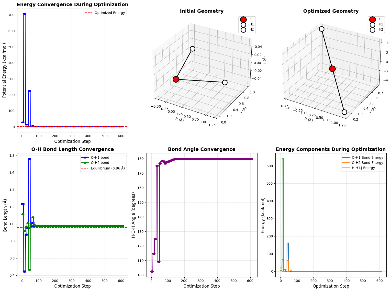 Bond Optimization: Both O-H bonds converge to approximately 0.96 Å, the equilibrium distance specified in our potential.
