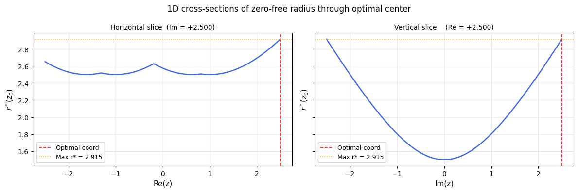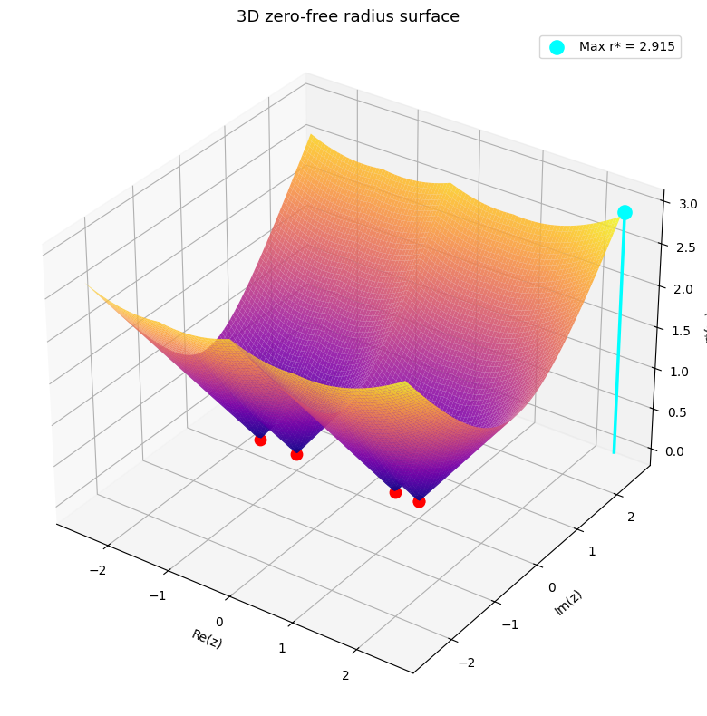 The zero-free radius surface is non-smooth (it has ridge lines where two roots are equidistant) but continuous. SciPy’s differential_evolution handles this robustly without needing gradients. We minimize $-r^*(z_0)$ to find the global maximum.