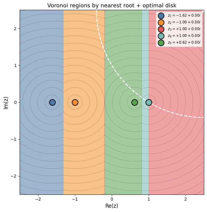Figure 3 (Voronoi diagram) — Each colored region is the set of points closer to one particular zero than to any other. The optimal center always lies on a Voronoi vertex — the meeting point of three or more regions — because it is equidistant to (at least) two zeros, and that equidistance is what allows the disk to be as large as possible.