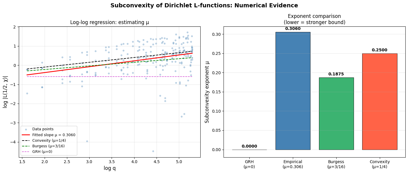 Figure 1, Left — Log-log scatter and regression. Each blue dot is one pair $(\log q,, \log|L(\tfrac{1}{2}, \chi)|)$ for a primitive character $\chi \bmod q$. The red line is the fitted slope $\mu_{\text{emp}}$. The dashed lines mark the convexity bound (black, $\mu=1/4$), Burgess bound (green, $\mu=3/16$), and GRH target (magenta, $\mu=0$). Points scattered systematically below the convexity line provide direct numerical evidence of subconvex behavior.