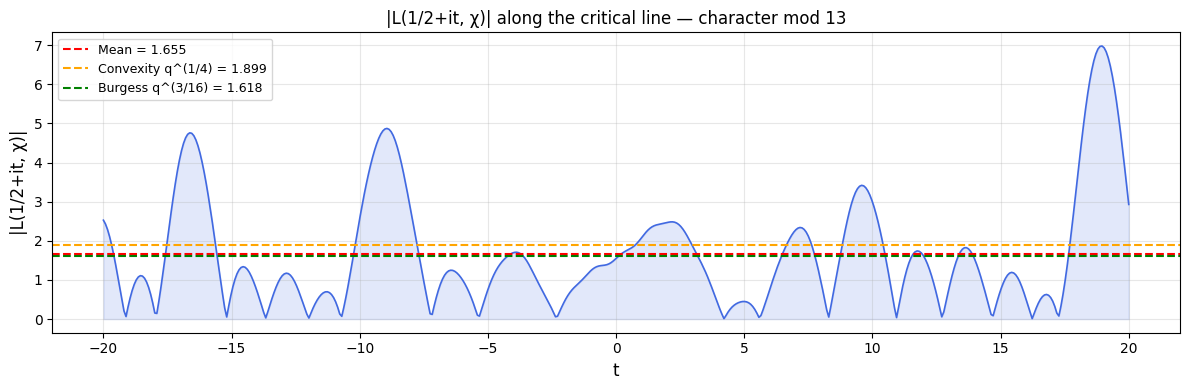 Figure 3 — $|L(1/2 + it, \chi)|$ along the critical line. The oscillatory blue curve shows how the $L$-function magnitude varies as we move vertically along $\sigma = 1/2$. Near-zero dips correspond to zeros on (or near) the critical line. The horizontal dashed lines mark the convexity bound (orange) and Burgess bound (green) computed for $q = 13$. The function hugs well below both bounds for most of the range — a vivid illustration of subconvexity in action.