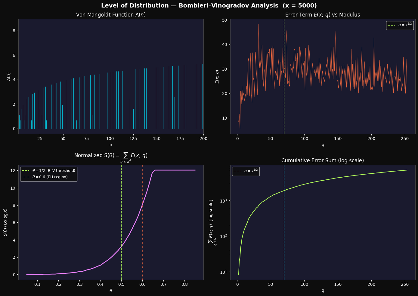 This numerical experiment gives a concrete feel for the level of distribution concept in sieve theory. The Bombieri–Vinogradov theorem guarantees controlled average error up to $\theta = 1/2$; our plots show exactly where this control starts to loosen. The Elliott–Halberstam conjecture — that $\theta$ can be pushed arbitrarily close to 1 — remains one of the central open problems in analytic number theory, with profound implications: it would, for instance, imply a bounded gap between primes in a very strong quantitative form.