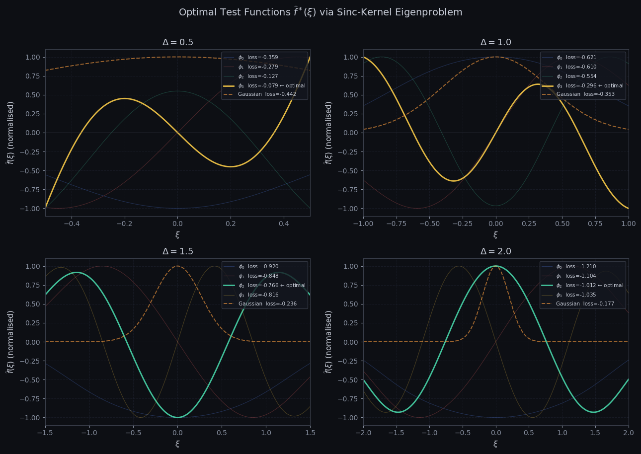 The eigenfunctions of this sinc-squared kernel are the classical Prolate Spheroidal Wave Functions (PSWFs) $\phi_0, \phi_1, \phi_2, \ldots$, which are the unique functions maximally concentrated in $[-\Delta, \Delta]$ in the $L^2$ sense. Our optimal test function is whichever PSWF $\phi_k$ maximizes $\mathcal{L}$.