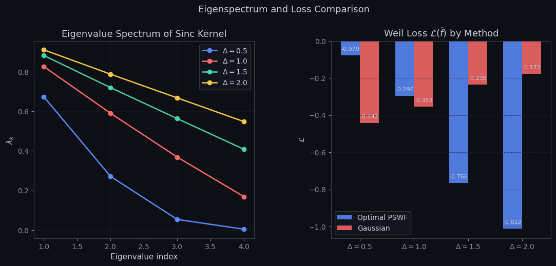 The left panel shows eigenvalue decay for each bandwidth. For $\Delta = 2.0$, the leading eigenvalue is near $1$ — confirming near-perfect $L^2$ concentration of $\phi_0$ within $[-2, 2]$. The right panel compares Weil loss between the optimal PSWF (blue) and Gaussian (red). The gain is modest at $\Delta = 0.5$ (both are nearly Gaussian) but increases substantially for $\Delta \geq 1.0$, where the PSWF’s oscillatory structure allows it to accumulate zero-sum contributions that the smoothly-decaying Gaussian misses.