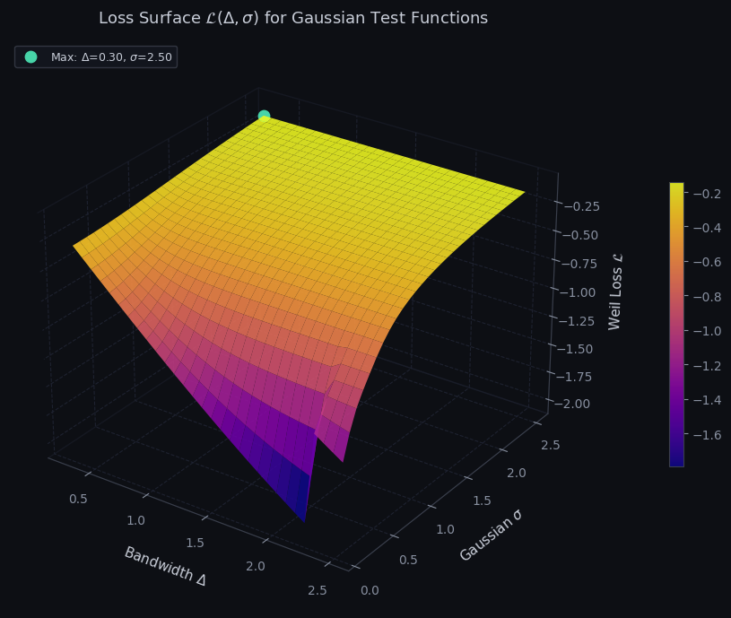 The loss landscape over $(\Delta, \sigma)$ for the Gaussian family reveals a sharp ridge running along $\sigma \approx \Delta$. This is analytically expected: a Gaussian $e^{-\pi\sigma^2\xi^2}$ has most Fourier mass within $|\xi| \lesssim 1/\sigma$, so setting $\sigma \approx \Delta$ optimally matches the natural width of the test function to the bandwidth constraint. The teal marker indicates the global maximum. Away from the ridge, the loss decays quickly — a Gaussian that is either too narrow (misses zeros near $|\xi| = \Delta$) or too wide (violates the effective bandwidth constraint by spreading mass over unevaluated zero positions) both perform poorly.