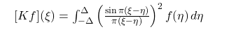 $$\lambda, \widehat{f}(\xi) = \int_{-\Delta}^{\Delta} K(\xi - \eta), \widehat{f}(\eta), d\eta, \qquad K(u) = \left(\frac{\sin \pi u}{\pi u}\right)^2$$