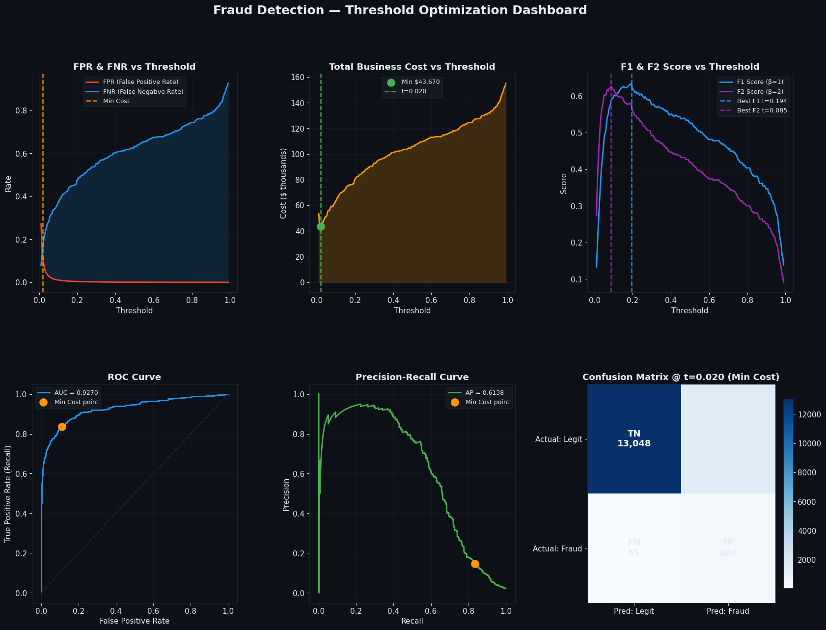 print(f" [Min Cost] threshold={opt_cost['threshold']:.3f} " f"FPR={opt_cost['fpr']:.3f} FNR={opt_cost['fnr']:.3f} " f"Cost=${opt_cost['total_cost']:,.0f}") print(f" [Best F1] threshold={opt_f1['threshold']:.3f} " f"FPR={opt_f1['fpr']:.3f} FNR={opt_f1['fnr']:.3f} " f"Cost=${opt_f1['total_cost']:,.0f}") print(f" [Best F2] threshold={opt_f2['threshold']:.3f} " f"FPR={opt_f2['fpr']:.3f} FNR={opt_f2['fnr']:.3f} " f"Cost=${opt_f2['total_cost']:,.0f}\n")