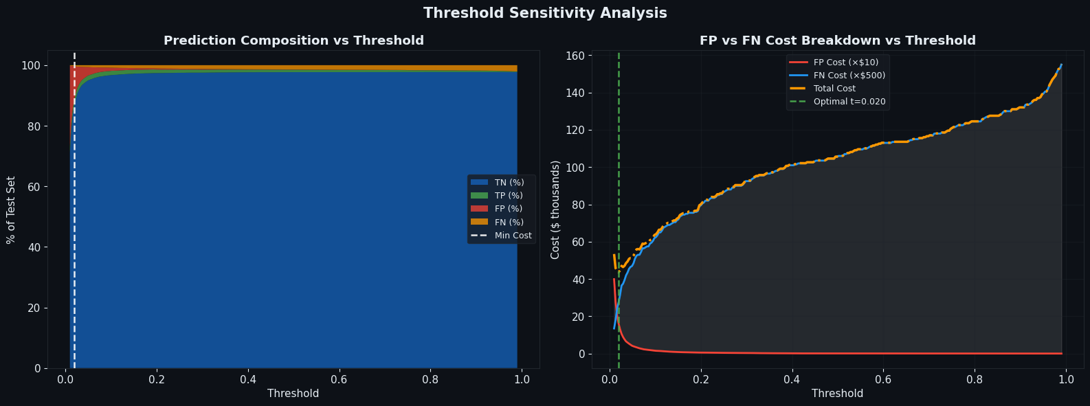ax_s1.stackplot(df['threshold'], tn_pct, tp_pct, fp_pct, fn_pct, labels=['TN (%)','TP (%)','FP (%)','FN (%)'], colors=['#1565C0','#4CAF50','#F44336','#FF9800'], alpha=0.75) vline(ax_s1, opt_cost['threshold'], 'Min Cost', 'white') ax_s1.set_xlabel('Threshold'); ax_s1.set_ylabel('% of Test Set') ax_s1.set_title('Prediction Composition vs Threshold', fontweight='bold', color=COLORS['text']) ax_s1.legend(loc='center right', fontsize=9) ax_s1.tick_params(colors=COLORS['text'])