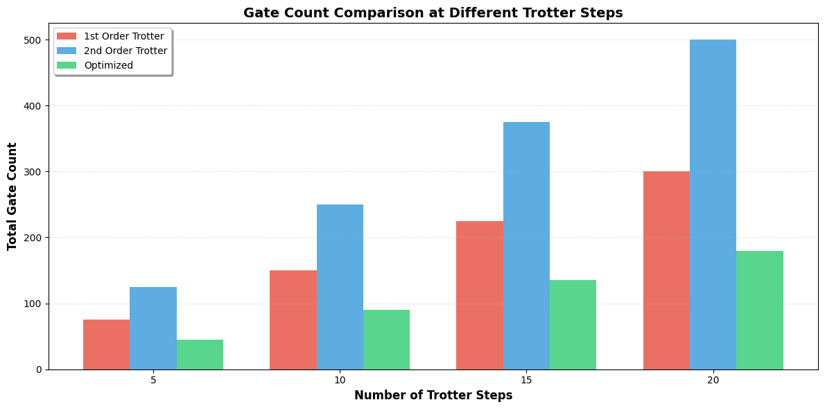 def plot_results(n_steps_range, results): """Create comprehensive visualization of results""" fig, axes = plt.subplots(2, 2, figsize=(14, 10)) fig.suptitle('Circuit Depth Optimization: Comparative Analysis', fontsize=16, fontweight='bold') colors = { 'first_order': '#E74C3C', 'second_order': '#3498DB', 'optimized': '#2ECC71' } labels = { 'first_order': '1st Order Trotter', 'second_order': '2nd Order Trotter', 'optimized': 'Optimized' } ax1 = axes[0, 0] for method, color in colors.items(): ax1.plot(n_steps_range, results[method]['gates'], marker='o', linewidth=2, label=labels[method], color=color, markersize=6) ax1.set_xlabel('Number of Trotter Steps', fontsize=11) ax1.set_ylabel('Total Gate Count', fontsize=11) ax1.set_title('Gate Count vs. Trotter Steps', fontsize=12, fontweight='bold') ax1.legend(frameon=True, shadow=True) ax1.grid(True, alpha=0.3, linestyle='--') ax2 = axes[0, 1] for method, color in colors.items(): ax2.plot(n_steps_range, results[method]['two_qubit_gates'], marker='s', linewidth=2, label=labels[method], color=color, markersize=6) ax2.set_xlabel('Number of Trotter Steps', fontsize=11) ax2.set_ylabel('Two-Qubit Gate Count', fontsize=11) ax2.set_title('Two-Qubit Gates (CNOT) Count', fontsize=12, fontweight='bold') ax2.legend(frameon=True, shadow=True) ax2.grid(True, alpha=0.3, linestyle='--') ax3 = axes[1, 0] for method, color in colors.items(): ax3.plot(n_steps_range, results[method]['fidelity'], marker='^', linewidth=2, label=labels[method], color=color, markersize=6) ax3.set_xlabel('Number of Trotter Steps', fontsize=11) ax3.set_ylabel('Fidelity with Exact Evolution', fontsize=11) ax3.set_title('Simulation Fidelity', fontsize=12, fontweight='bold') ax3.legend(frameon=True, shadow=True) ax3.grid(True, alpha=0.3, linestyle='--') ax3.set_ylim([0.95, 1.0]) ax4 = axes[1, 1] for method, color in colors.items(): efficiency = np.array(results[method]['fidelity']) / np.array(results[method]['gates']) ax4.plot(n_steps_range, efficiency * 1000, marker='D', linewidth=2, label=labels[method], color=color, markersize=6) ax4.set_xlabel('Number of Trotter Steps', fontsize=11) ax4.set_ylabel('Fidelity per Gate (×10⁻³)', fontsize=11) ax4.set_title('Circuit Efficiency', fontsize=12, fontweight='bold') ax4.legend(frameon=True, shadow=True) ax4.grid(True, alpha=0.3, linestyle='--') plt.tight_layout() plt.savefig('circuit_optimization_results.png', dpi=300, bbox_inches='tight') plt.show() fig2, ax = plt.subplots(1, 1, figsize=(12, 6)) n_steps_sample = [5, 10, 15, 20] x_pos = np.arange(len(n_steps_sample)) width = 0.25 for i, method in enumerate(['first_order', 'second_order', 'optimized']): gates_sample = [results[method]['gates'][n-1] for n in n_steps_sample] ax.bar(x_pos + i*width, gates_sample, width, label=labels[method], color=colors[method], alpha=0.8) ax.set_xlabel('Number of Trotter Steps', fontsize=12, fontweight='bold') ax.set_ylabel('Total Gate Count', fontsize=12, fontweight='bold') ax.set_title('Gate Count Comparison at Different Trotter Steps', fontsize=14, fontweight='bold') ax.set_xticks(x_pos + width) ax.set_xticklabels(n_steps_sample) ax.legend(frameon=True, shadow=True) ax.grid(True, alpha=0.3, axis='y', linestyle='--') plt.tight_layout() plt.savefig('gate_count_comparison.png', dpi=300, bbox_inches='tight') plt.show()