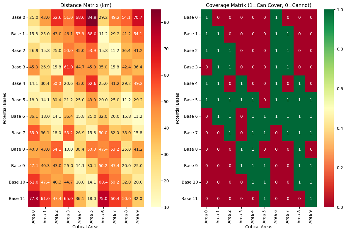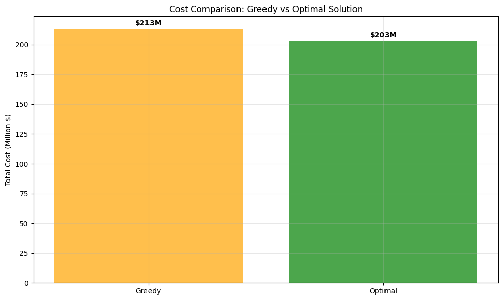 class EconomicZoneOptimizer: """ A class to optimize economic zone development through mathematical modeling. This includes facility location, network design, and resource allocation. """ def __init__(self, cities, populations, gdp_per_capita): """ Initialize the optimizer with city data. Parameters: cities (list): List of city names populations (list): Population of each city gdp_per_capita (list): GDP per capita for each city """ self.cities = cities self.populations = np.array(populations) self.gdp_per_capita = np.array(gdp_per_capita) self.n_cities = len(cities) np.random.seed(42) self.coordinates = np.random.rand(self.n_cities, 2) * 100 self.distance_matrix = self._calculate_distances() self.economic_potential = self.populations * self.gdp_per_capita def _calculate_distances(self): """Calculate Euclidean distances between all pairs of cities.""" distances = np.zeros((self.n_cities, self.n_cities)) for i in range(self.n_cities): for j in range(self.n_cities): distances[i, j] = np.sqrt( (self.coordinates[i, 0] - self.coordinates[j, 0])**2 + (self.coordinates[i, 1] - self.coordinates[j, 1])**2 ) return distances def calculate_infrastructure_cost(self, distance, population_i, population_j): """ Calculate infrastructure cost between two cities. Cost increases with distance but decreases with economic benefit. """ base_cost = distance * 1000 economic_factor = np.sqrt(population_i * population_j) / 10000 return base_cost / (1 + economic_factor) def optimize_hub_selection(self, max_hubs=5): """ Optimize hub selection using K-means clustering and economic potential. """ kmeans = KMeans(n_clusters=min(max_hubs, self.n_cities), random_state=42) clusters = kmeans.fit_predict(self.coordinates) hubs = [] hub_indices = [] for cluster_id in range(max(clusters) + 1): cluster_cities = np.where(clusters == cluster_id)[0] best_city = cluster_cities[np.argmax(self.economic_potential[cluster_cities])] hubs.append(self.cities[best_city]) hub_indices.append(best_city) return hub_indices, hubs def optimize_network_topology(self, hub_indices): """ Optimize network connections between hubs using minimum spanning tree approach. """ n_hubs = len(hub_indices) hub_costs = np.zeros((n_hubs, n_hubs)) for i in range(n_hubs): for j in range(n_hubs): if i != j: city_i, city_j = hub_indices[i], hub_indices[j] hub_costs[i, j] = self.calculate_infrastructure_cost( self.distance_matrix[city_i, city_j], self.populations[city_i], self.populations[city_j] ) G = nx.Graph() for i in range(n_hubs): for j in range(i + 1, n_hubs): G.add_edge(i, j, weight=hub_costs[i, j]) mst = nx.minimum_spanning_tree(G, weight='weight') return mst, hub_costs def calculate_trade_efficiency(self, hub_indices, mst): """ Calculate trade efficiency metrics for the optimized network. """ path_lengths = [] total_trade_volume = 0 for i in range(len(hub_indices)): for j in range(i + 1, len(hub_indices)): try: path_length = nx.shortest_path_length(mst, i, j, weight='weight') path_lengths.append(path_length) city_i, city_j = hub_indices[i], hub_indices[j] trade_volume = (self.economic_potential[city_i] * self.economic_potential[city_j]) / path_length total_trade_volume += trade_volume except nx.NetworkXNoPath: path_lengths.append(float('inf')) avg_path_length = np.mean([p for p in path_lengths if p != float('inf')]) efficiency_score = total_trade_volume / (avg_path_length + 1) return { 'average_path_length': avg_path_length, 'total_trade_volume': total_trade_volume, 'efficiency_score': efficiency_score, 'connectivity': len([p for p in path_lengths if p != float('inf')]) / len(path_lengths) } def run_optimization(self, max_hubs=5): """ Run the complete optimization process. """ print("🏗️ Starting Economic Zone Optimization...") print("📍 Optimizing hub selection...") hub_indices, hub_cities = self.optimize_hub_selection(max_hubs) print("🌐 Optimizing network topology...") mst, hub_costs = self.optimize_network_topology(hub_indices) print("📊 Calculating efficiency metrics...") efficiency_metrics = self.calculate_trade_efficiency(hub_indices, mst) total_cost = sum([mst[u][v]['weight'] for u, v in mst.edges()]) results = { 'hub_indices': hub_indices, 'hub_cities': hub_cities, 'network': mst, 'hub_costs': hub_costs, 'total_cost': total_cost, 'efficiency_metrics': efficiency_metrics } print("✅ Optimization complete!") return results def visualize_results(self, results): """ Create comprehensive visualizations of the optimization results. """ fig = plt.figure(figsize=(20, 15)) ax1 = plt.subplot(2, 3, 1) scatter = ax1.scatter(self.coordinates[:, 0], self.coordinates[:, 1], c=self.economic_potential, s=self.populations/1000, alpha=0.6, cmap='viridis', edgecolors='black') hub_coords = self.coordinates[results['hub_indices']] ax1.scatter(hub_coords[:, 0], hub_coords[:, 1], c='red', s=200, marker='*', edgecolors='black', linewidth=2, label='Economic Hubs') mst = results['network'] for edge in mst.edges(): i, j = results['hub_indices'][edge[0]], results['hub_indices'][edge[1]] ax1.plot([self.coordinates[i, 0], self.coordinates[j, 0]], [self.coordinates[i, 1], self.coordinates[j, 1]], 'r-', linewidth=2, alpha=0.7) for i, city in enumerate(self.cities): ax1.annotate(city, (self.coordinates[i, 0], self.coordinates[i, 1]), xytext=(5, 5), textcoords='offset points', fontsize=8) ax1.set_title('Optimized Economic Zone Network', fontsize=14, fontweight='bold') ax1.set_xlabel('X Coordinate (km)') ax1.set_ylabel('Y Coordinate (km)') plt.colorbar(scatter, ax=ax1, label='Economic Potential') ax1.legend() ax1.grid(True, alpha=0.3) ax2 = plt.subplot(2, 3, 2) edge_costs = [mst[u][v]['weight'] for u, v in mst.edges()] edge_labels = [f"Hub {u+1}-{v+1}" for u, v in mst.edges()] bars = ax2.bar(range(len(edge_costs)), edge_costs, color='skyblue', edgecolor='navy') ax2.set_title('Infrastructure Costs by Connection', fontsize=14, fontweight='bold') ax2.set_xlabel('Network Connections') ax2.set_ylabel('Cost (Million $)') ax2.set_xticks(range(len(edge_labels))) ax2.set_xticklabe