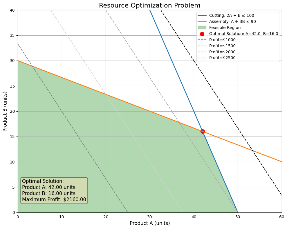 This example demonstrates how $Python$ can be used to solve resource allocation problems that businesses commonly face, showing both the numerical solution and a graphical representation to understand the problem space.